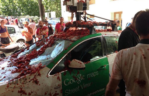 8月28日消息 除了全球闻名的“奔牛节”外,西班牙人也时不时搞一些野外狂欢节日,其中一个就是有名的“番茄大战”,该节日每年一次,巴伦西亚自治区西部的布尼奥尔(Buñol)小镇举行。当地人在街头搞一个大规模战斗,而150吨西红柿是他们唯一可以选择的武器,这是当地人的狂欢,但是今年对于谷歌街景车而言就不是一个合适的造访时机了。