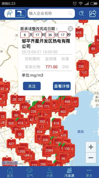 马军:公众下载APP后,会看到自己所在城市的环境情况,了解到什么企业在污染环境,他们会把污染信息截图,通过微博等举报给环保部门。目前比较活跃的是山东、浙江、北京等省市。尤其是山东,它们各级环保部门都有官微。很多网友发现污染情况直接@官微举报。