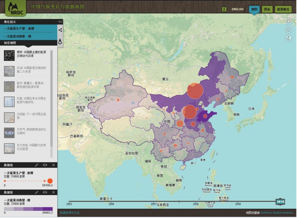 和IPE的可视化污染情况的努力类似,美国自然资源保护委员会(NRDC)中国项目部于2012年9月26日发布的“中国气候与能源地图”,是另一 个有意思的有关中国的数据可视化方面的工作(见图2)。如图2所示,该地图形象地展示了中国各省份能源消耗的情况。地图由流行的HTML5的方式生成。数 据覆盖2005年至2010年,是关于中国能源问题可视化的一个有益探索。
