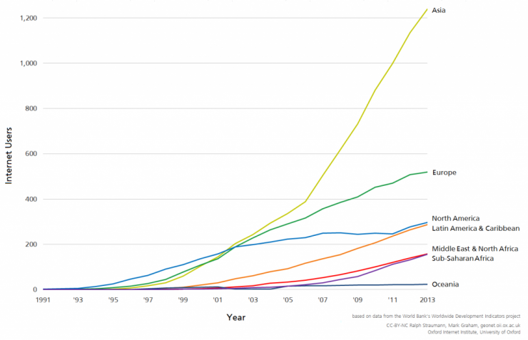 也许这是一张比墙上挂的世界地图更加纯粹的地图:牛津互联网研究所根据互联网用户人数制作了一张新版世界地图(戳此可查看完整研究报告及大图)。