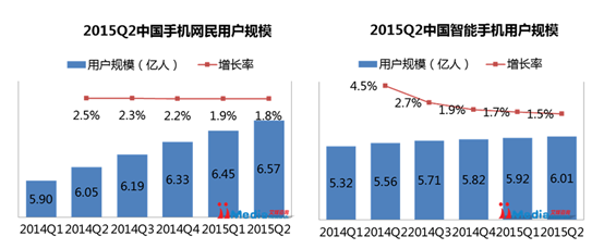 互联网+社区意味着线上和线下资源的整合,而在此过程中互联网及移动互联网即为其中桥梁。iiMediaResearch(艾媒咨询)数据显示,截止2015Q2,中国手机网民用户规模达到6.57亿人,中国智能手机用户达6.01亿人。