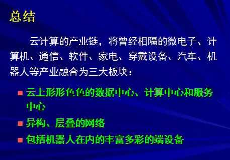 我们还在想,怎么研发新兴云机器人研究脑认知。能不能研发机器人再现老年如何痴呆?能不能研发机器人再现老年痴呆如何康复等。同时我总结一下,云计算的产业链将曾经相隔的微电子、计算机、通信、软件、家电、穿戴设备、汽车、机器人等产业融合为三大板块。云上形形色色的数据中心、计算中心各服务中心;异构层叠的网络;以产品为中心的产业链方式,已经转变为以服务为中心的利益攸关方的相互渗透,协商共赢方式,云服务提供商成为产业链的主角。我们要更加关注客户体验和大数据价值发现,更加关注以车联网为代表的物联网,更加关注机器人认知,或机器人联网,谢谢大家!